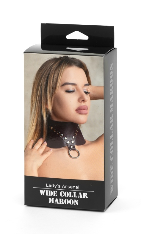 Ошейник выполнен из натуральной кожи бордового цвета, декорирован заклепками в иде V символа и металлическим кольцом спереди. Сзади аксессуар надежно фиксируется пряжкой, ремень позволяет выбрать нужный размер. Стильный аксессуар поможет воплотить эротические фантазии в реальность.