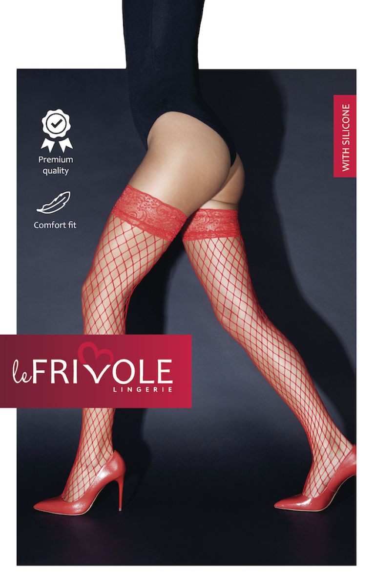 Горячие барышни обязательно оценят нашу модель ярко-красных чулок в крупную сетку с кружевной резинкой на силиконе. Еще бы, от одного только взгляда на ножки в таких чулках просыпается желание и страсть. Не стоит отказывать себе в возможности быть яркой, манящей и безумно сексуальной. · Эквивалентны российскому размеру 42-46. Плотность эквивалентна 20 ден.