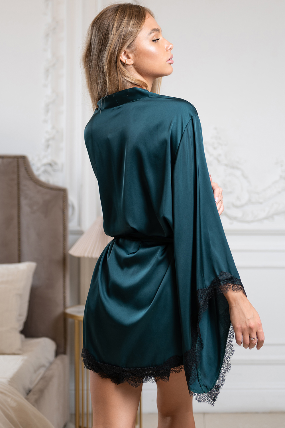 Игривый, струящийся и изящный халат из темно-зеленого армани шелка. Халат с элегантными рукавами и кружевом, притягательного темно-зеленого цвета, в котором ты точно не останешься не замеченной. А поясом от халата ты можешь связать руки любимому или завязать глаза. Дополни образ темно-зеленой сорочкой с маской на глаза!