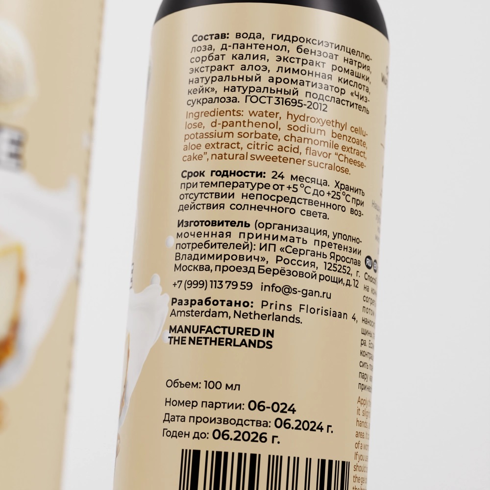 Лубрикант на водной основе “SGAN” со вкусом чизкейка разработан сексологами в Нидерландах.Вкусовая линейка лубрикантов "SGAN" разработана с учетом физиологии, совмещает в себе вкус и аромат, при этом сохраняет все регенерирующие свойства классического лубриканта. Не оставляет липкости, без химического привкуса, не содержит сахара и калорий. Для сладости добавлен натуральный подсластитель - сукралоза. Абсолютно безопасен для проникновения и при проглатывании. Эксклюзивная густая формула обеспечивает лучшее обволакивание половых органов, тем самым гарантируя приятные ощущения без высыхания и обеспечивая экстра долгое скольжение. Благодаря исключительно высококачественным компонентам сохраняет естественный pH баланс слизистых, не вызывает жжения и неприятных ощущений.