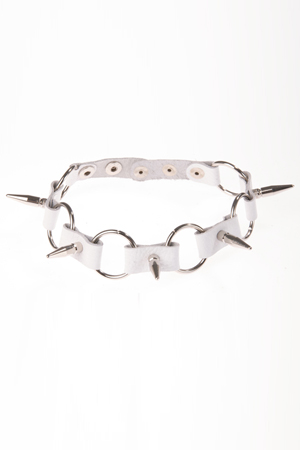 Ошейник с кольцами и шипами. Изготовлен из натуральной кожи. При изготовлении использована никелированная фурнитура. Ширина ошейника 20 мм, длина шипов 25 мм. Размер универсальный. Цвет: белый.