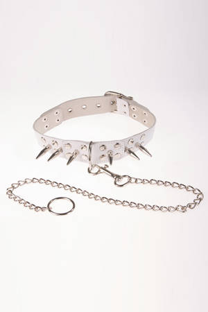 Ошейник. Изготовлен из натуральной кожи с велюровой подкладой. При изготовлении использована никелированная фурнитура. Ширина ошейника 30 мм, длина шипов 25 мм, длина цепочки (поводка) с карабином 50 см. Один из основных атрибутов BDSM.