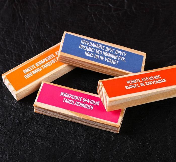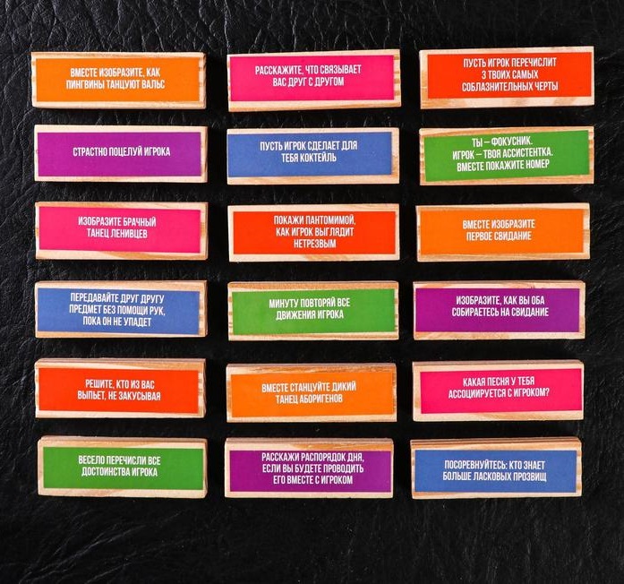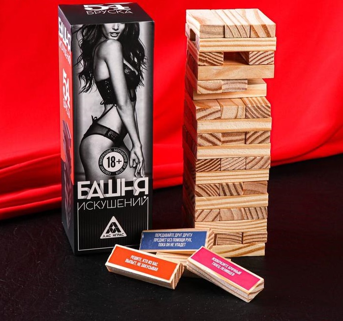 Устройте вечеринку, будоражащую ваше воображение! Постройте падающую башню, позовите друзей и выполняйте пикантные задания! В наборе вы найдёте 54 деревянных бруска с фантами, способными поднять настроение каждому! «Дженга» — залог общения и раскрепощения!Неожиданные задания разнообразят любой праздник! Каждое написано на фоне определённого цвета (всего их шесть). Перед началом игры распределите цвета между игроками. Постройте башню и вытягивайте бруски так, чтобы она не упала. Тот, кто вытянул деталь, зачитывает задание и выполняет его с тем игроком, чей цвет указан на бруске. Вас ждут веселье, много смеха и пикантных подробностей — устоять просто невозможно!