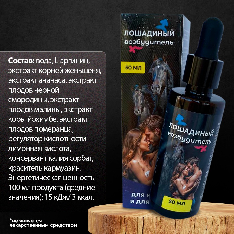 Лошадиный возбудитель – мощный и эффективный БАД для мужчин и женщин, созданный для пробуждения страсти и усиления сексуального влечения. Эти возбуждающие капли сочетают в себе тщательно подобранные натуральные компоненты, обеспечивающие быстрое и ощутимое действие.Позвольте себе наслаждаться яркими и страстными моментами с Лошадиным возбудителем – каплями, которые пробуждают желание и усиливают удовольствие. Откройте новые горизонты сексуального наслаждения и укрепите свое здоровье с этим уникальным и мощным продуктом. Показания к применению: Снижение сексуального влечения и либидо. Сексуальная дисфункция, связанная с недостаточной возбудимостью. Усталость, напряжение и стресс, влияющие на сексуальную активность. Потребность в усилении ощущений и улучшении качества интимной жизни. Профилактика и поддержание здоровья половой системы. Рекомендации по применению: Разведите 45 капель (3 мл) концентрированного напитка в 100-200 мл воды или любого безалкогольного напитка. Объем: 50 мл.